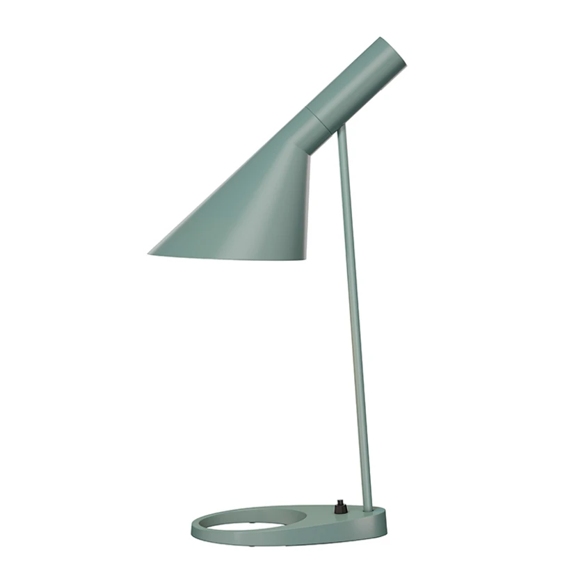 La lampe de table AJ en pétrole clair est équipée d'une tête de luminaire à la forme asymétrique caractéristique, essentielle aux qualités lumineuses du luminaire. La tête du luminaire de la lampe de table AJ peut être inclinée et tournée de 60 degrés d'un côté à l'autre. Avec son look unique, cette lampe est un classique moderne.