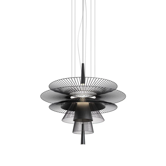 Gravity 1 Suspension Black est une construction métallique inventive qui semble flotter en apesanteur. La combinaison de tiges métalliques et de cercles de l'Abat-jour contribue à l'interaction harmonieuse entre les formes, qui flottent ensemble, créant un bel effet visuel lorsque la lampe est allumée.
